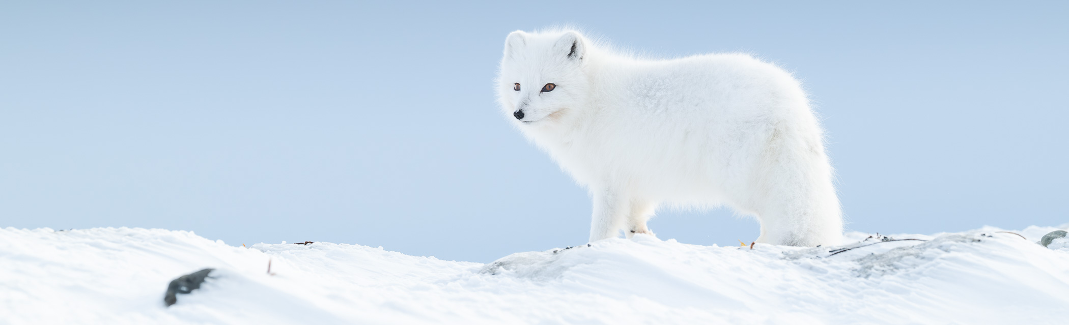 Allen voran der Polarfuchs: Er ist allgegenwärtig und dennoch fotografisch anspruchsvoll. Trotz seiner Häufigkeit braucht es viel Know-how, um ihn zu finden und wirklich nah und authentisch zu erleben – insbesondere in der Gruppe. Polarfüchse sind scheu, zugleich aber erstaunlich aufmerksam und neugierig. Mit der richtigen Herangehensweise kommt es auf jeder Reise zu intensiven Begegnungen, bei denen die Tiere oft bis auf wenige Meter an die Fotografengruppe herankommen und so eindrückliche, intime Aufnahmen ermöglichen.