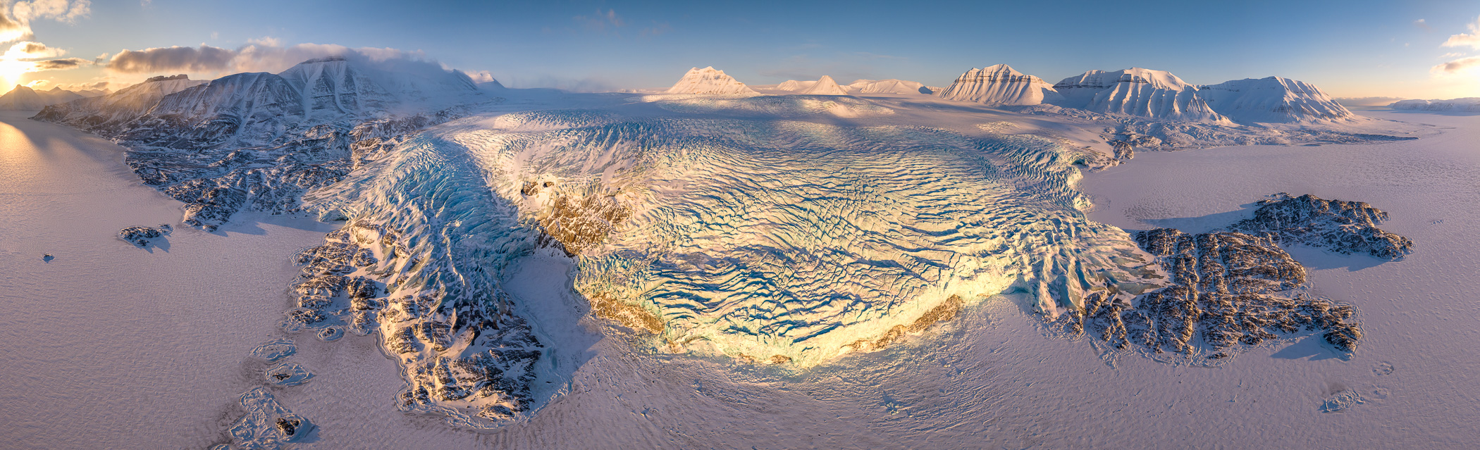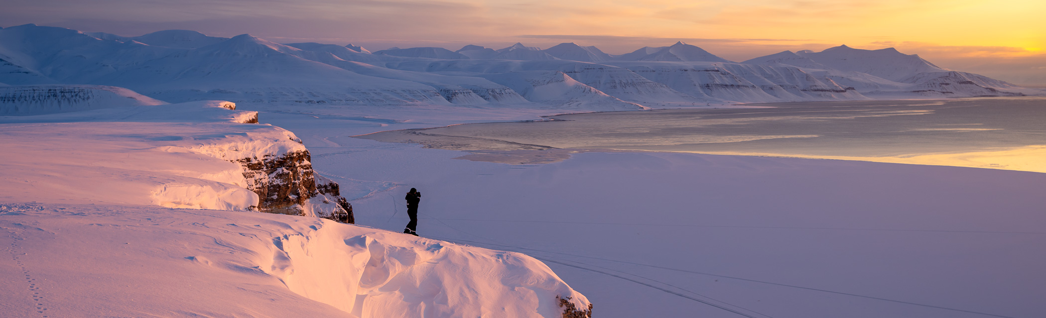 Das Thermometer zeigt minus 30 Grad. Wir stehen draussen vor den Schneemobilen, die der Sturm der vergangenen Nacht unter einer feinen, zehn Zentimeter dicken Schneeschicht begraben hat. Während wir den Schnee von Sitz und Lenker wischen, sind die Kamerarucksäcke bereits sicher verstaut, Atemwolken steigen in die klare Polarluft und in der Ferne kündigt sich langsam der neue Tag an. Noch liegt die Landschaft im bläulichen Halbdunkel, als wir die Motoren starten und für gut eine Stunde über gefrorene Ebenen und Gletscherflächen zu unserem Aussichtspunkt fahren. Erst dort, hoch über dem Tal, beginnt der Himmel sich zu verändern. Mit jedem Moment gewinnt das Licht an Farbe, bis sich der Horizont schliesslich in zarten Rosa- und Orangetönen öffnet und der arktische Morgen in seiner ganzen stillen Intensität erwacht.