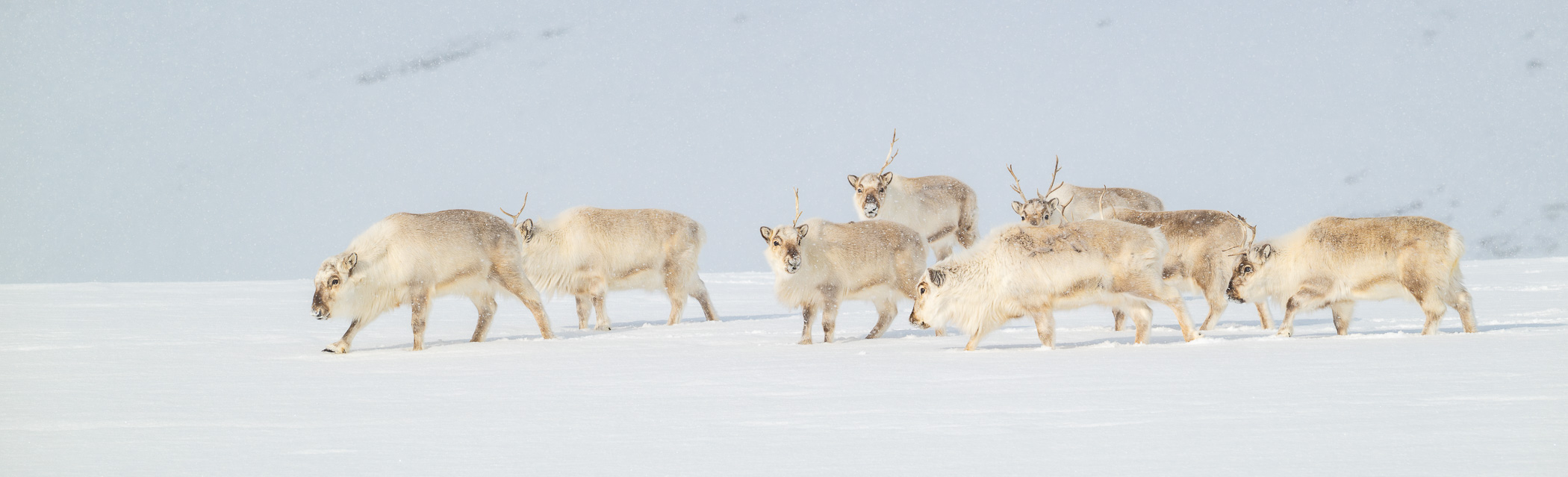 Nach einem sensationellen Sonnenaufgang, der sich nicht in Minuten, sondern über Stunden entfaltet, liegt die Landschaft in warmem, tiefem Licht. Die Sonne bleibt niedrig, streift die Schneeflächen und modelliert Hügel und Gletscher mit langen Schatten. Dieses Licht nutzen wir, um weiterzuziehen – zu einer kleinen Herde von Rentieren, die ruhig auf einer Hügelkuppe steht. Im Gegenlicht zeichnen sich ihre Silhouetten klar vor dem hellen Schnee ab, Atem dampft in der kalten Luft, jedes Bild wirkt zeitlos.